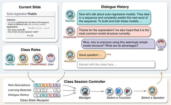 Large language models (LLMs) have been applied across various intelligent educational tasks to assist teaching. While preliminary studies have focused on task-specific, independent LLM-empowered agents, the potential of LLMs within a multi-agent collaborative framework for classroom simulation with real user participation remains unexplored. In this work, we propose SimClass, a multi-agent classroom simulation teaching framework. We recognize representative class roles and introduce a novel class control mechanism for automatic classroom teaching, and conduct user experiments in two real-world courses. Using the Flanders Interactive Analysis System and Community of Inquiry theoretical frameworks from educational analysis, we demonstrate that LLMs can simulate a dynamic learning environment for users with active teacher-student and student-student interactions. We also observe group behaviors among agents in SimClass, where agents collaborate to create enlivening interactions in classrooms to improve user learning process. We hope this work pioneers the application of LLM-empowered multi-agent systems in virtual classroom teaching. Our implementation and service can be found at https://github.com/THU-MAIC/SimClass.