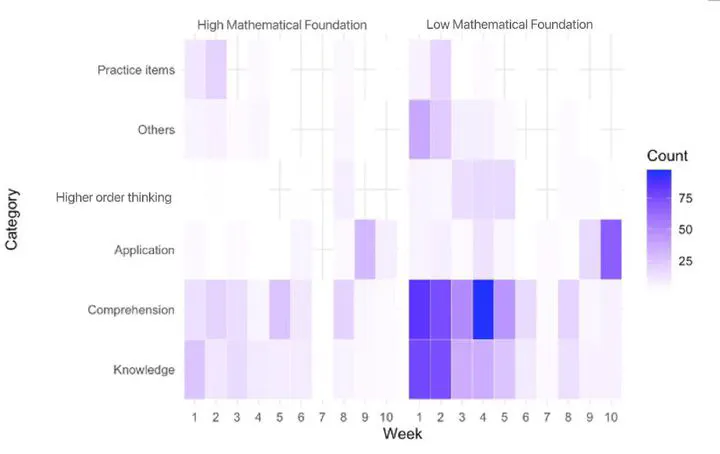 The study was conducted in an Advanced Quantitative Research Methods course involving 20 graduate students. During the course, student inquiries made to the AI were recorded and coded using Bloom’s taxonomy and the CLEAR framework. A series of independent sample t-tests and poisson regression analyses were employed to analyse the characteristics of different questions asked by students with different backgrounds. Post course interviews were conducted with 10 students to gain deeper insights into their perceptions. The findings revealed a U-shaped pattern in students’ use of the AI assistant, with higher usage at the beginning and towards the end of the course, and a decrease in usage during the middle weeks. Most questions posed to the AI focused on knowledge and comprehension levels, with fewer questions involving deeper cognitive thinking. Students with a weaker mathematical foundation used the AI assistant more frequently, though their inquiries tended to lack explicit and logical structure compared to those with a strong mathematical foundation, who engaged less with the tool. These patterns suggest the need for targeted guidance to optimise the effectiveness of AI tools for students with varying levels of academic proficiency.